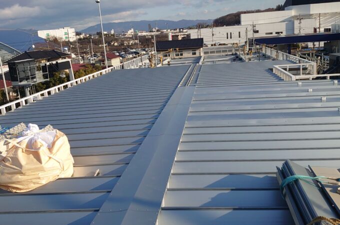 フレーム溶接 折板(せっぱん)屋根の施工中の写真です。倉庫や車庫、店舗などでよく使われる屋根です。